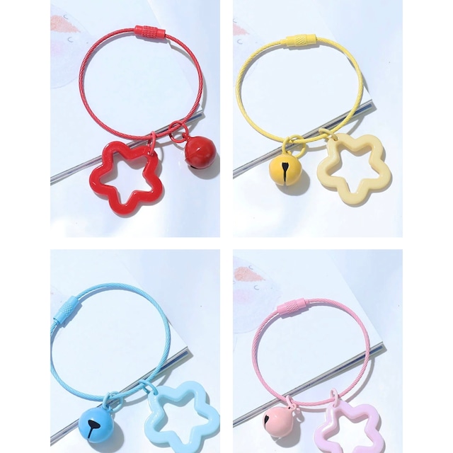 お気に入りのビーズやチャームを自由に付けて楽しめる、DIY用にもぴったりなワイヤーキーリング4個セットです。 しっかりとしたネジ式ワイヤーリングに、星型チャームと鈴が付いたデザイン。バッグやポーチ、鍵などのアクセントにぴったりです。 カラーは レッド / イエロー / ブルー / ピンク の4種類。 お揃いや気分に合わせて使い分けできます。 [サイズ] •全体:約 8.2cm •リング直径:約 5.1cm •星型チャーム:約 2.9cm •鈴:約 1.4cm •重さ:約 5.7g(1個あたり)